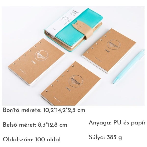 | Egyéb jellemzők | Dupla varrású PU bőr borítás, fém gyűrűkkel, kártyarendező, tolltartó, jó minőségű papír lapok |